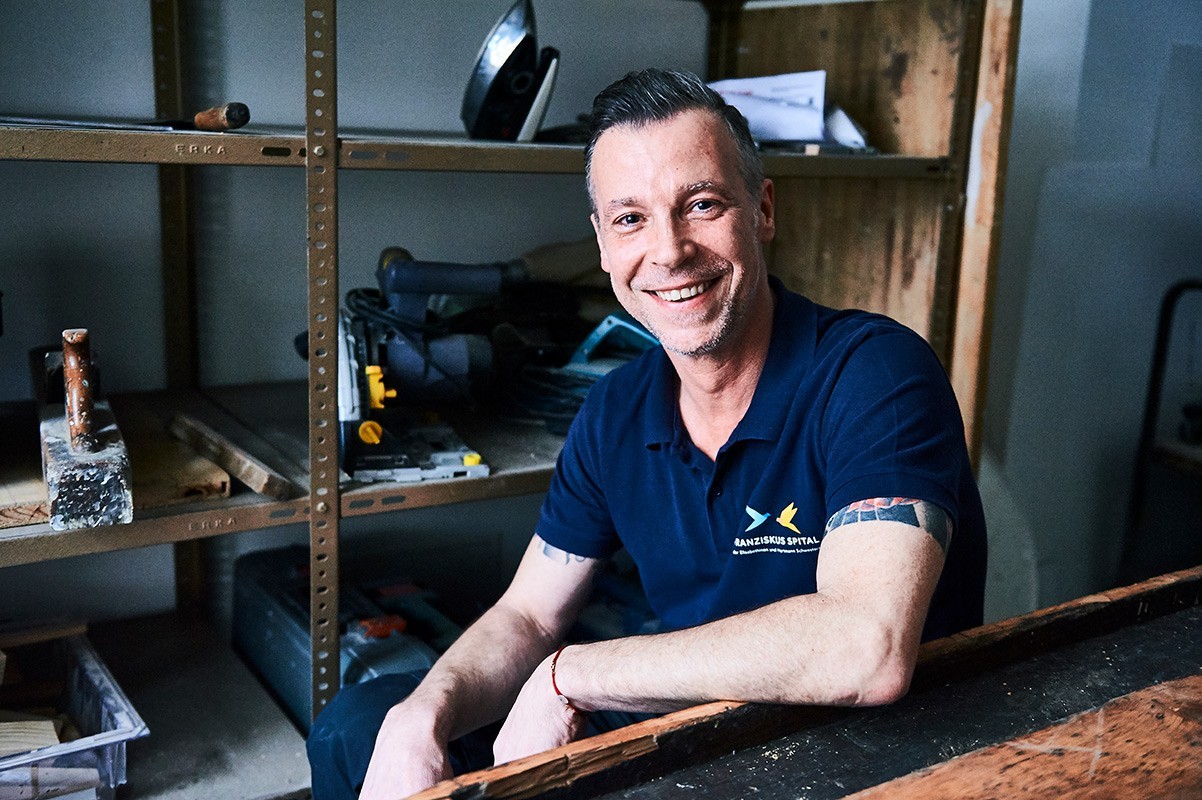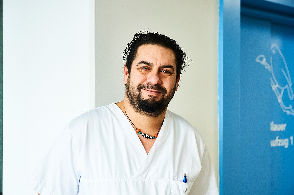 Ich bin in Wien geboren und aufgewachsen. Nach der Hauptschule habe ich Tischler gelernt, weil mein Vater das so wollte. Früher hat man nicht so auf die Wünsche von Kindern geachtet. Die Arbeit als Tischlergeselle war schlecht bezahlt und ich habe anschließend acht Jahre lang als Verkäufer in einem Geschäft für Autozubehör und als Filialleiter bei einem Maßmöbelerzeuger gearbeitet. 1993 haben meine Frau und ich geheiratet. Das ist 27 Jahre her. Sie ist Zahntechnikerin und zielstrebig, aber bei uns in Österreich musste sie als Serbin immer um Akzeptanz und Respekt kämpfen. Das laugt aus. Heute leitet sie ein Labor in Wien und kann trotz der vielen Arbeit innerlich entspannen. Unsere Freunde kommen aus Italien, Spanien, Bosnien, Türkei, Ungarn und Persien. Wir gehen oft auf Kulturveranstaltungen. Dadurch lernen wir verschiedene Menschen ganz anders kennen. Den typischen Ausländer gibt es nicht, es gibt nur Menschen, die von anderswo herkommen. Wir sollten uns weniger von den Medien beeinflussen lassen. Propaganda entzweit die Gesellschaft. Ich finde es schön, dass wir hier im Spital aus so vielen verschiedenen Ländern kommen und so gut zusammenarbeiten. Mein Sohn wächst anders auf als ich, wir zwingen ihm nichts auf. Er spricht Serbisch, Italienisch, Englisch und Deutsch. In diesem Sinn sind wir echte Wiener, denn Wien war schon immer multikulturell, sonst hätten wir nicht so viele KünstlerInnen und Intellektuelle aus dem Osten. Seit Juni 2019 arbeite ich im Franziskus Spital. Meine Arbeit stellt mich immer wieder vor neue Herausforderungen, das mag ich. Manchmal bringt sie mich auch ins Schwitzen. Auf jeden Fall wird mir nie langweilig denn wir machen hier wirklich alles.